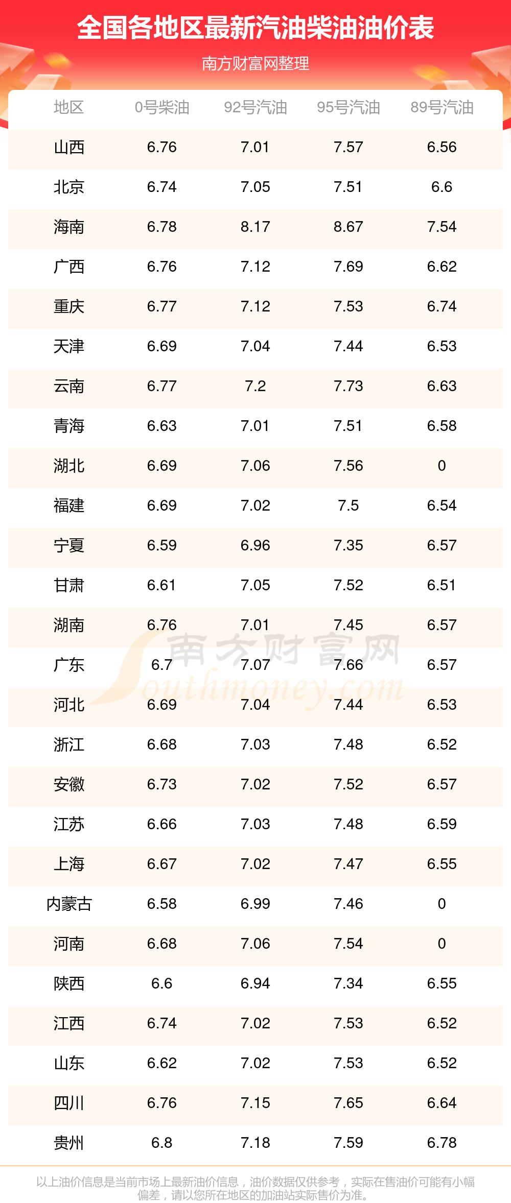以上油价信息是当前市场上最新油价信息,油价数据仅供参考,实际在售油价可能有小幅偏差,请以您所在地区的加油站实际售价为准。