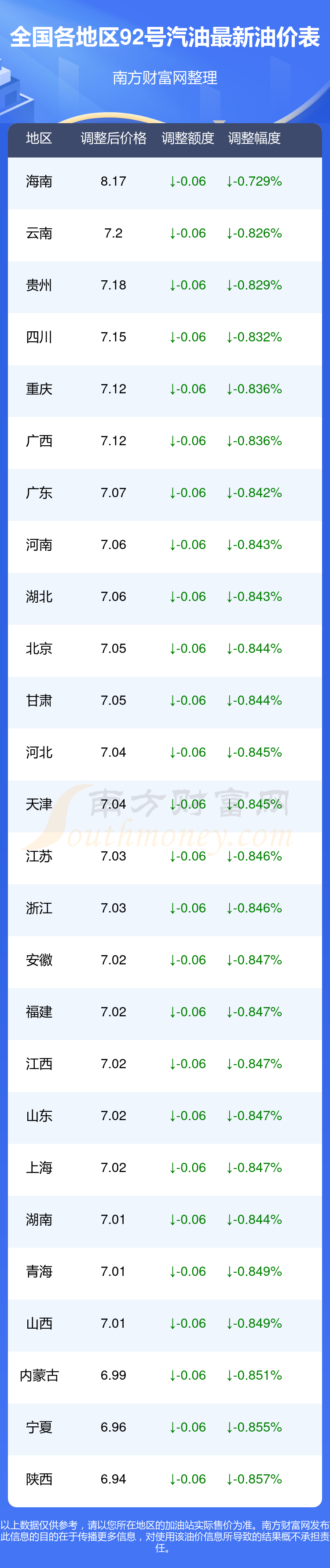 全国各地区最新92号汽油油价表
