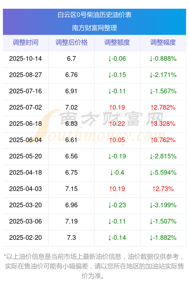 白云区0号柴油历史油价一览表