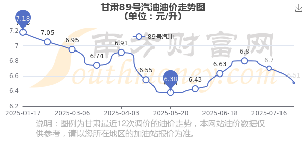 10月26日,甘肃89号汽油最新价格为:6.51元每升,调整时间为10月14日,相对上次调整时间7月16日的油价6.57元每升,跌了0.06元,跌幅达0.913%。