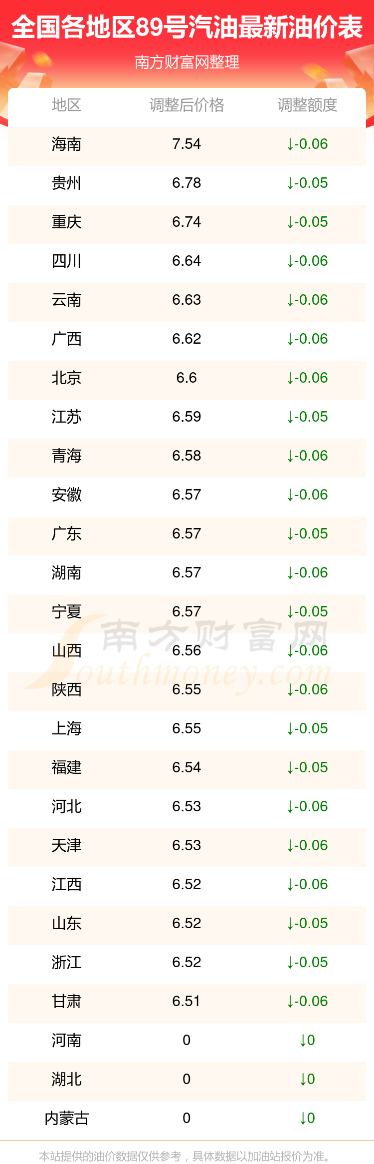10月26日全国89号汽油最新平均价格为每升7元(油价调整时间为10月14日),其中全国89号汽油最低为甘肃,价格为6.51元/升,89号汽油最高为海南,价格为7.54元/升。