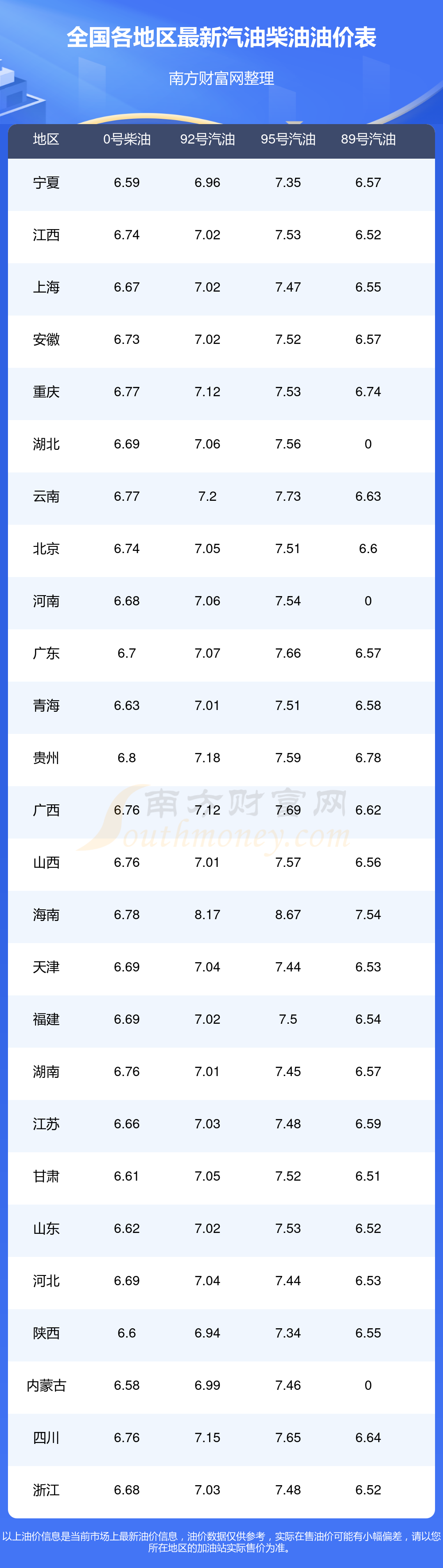 全国各地区最新汽油价格表