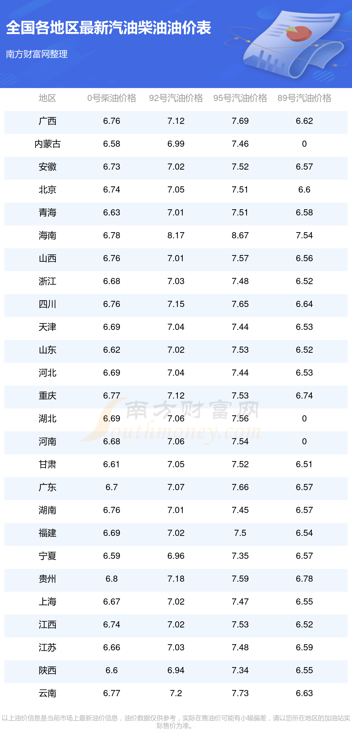 以上油价信息是当前市场上最新油价信息,油价数据仅供参考,实际在售油价可能有小幅偏差,请以您所在地区的加油站实际售价为准。