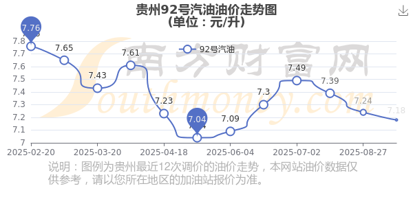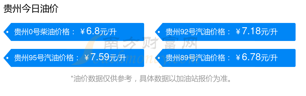 10月26日,贵州汽油、柴油的价格为10月14日调整后的价格。具体为:92号汽油7.18元,下调了0.06元;95号汽油7.59元,下调了0.06元;89号汽油6.78元,下调了0.05;0号柴油6.8元,下调了0.06元。