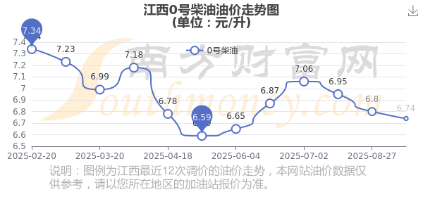 10月26日,江西0号柴油的价格是6.74元每升,本次的调整时间为10月14日,对比上次的调整下降了0.06元,下降0.882%,下次调整时间为10月27日24时,还有1.9天。