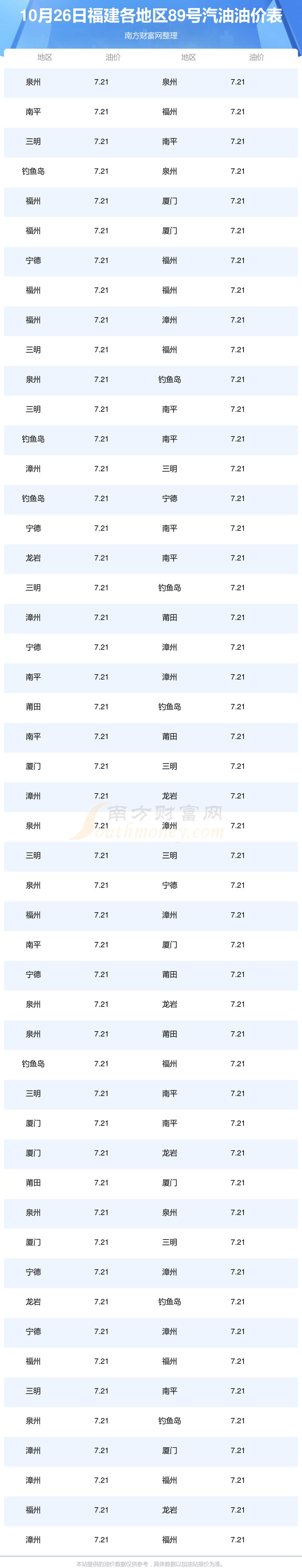 10月26日福建89号汽油的价格是10月14日调整后的价格,为6.54元每升,相对上一轮调整跌了0.05元,跌0.759%。