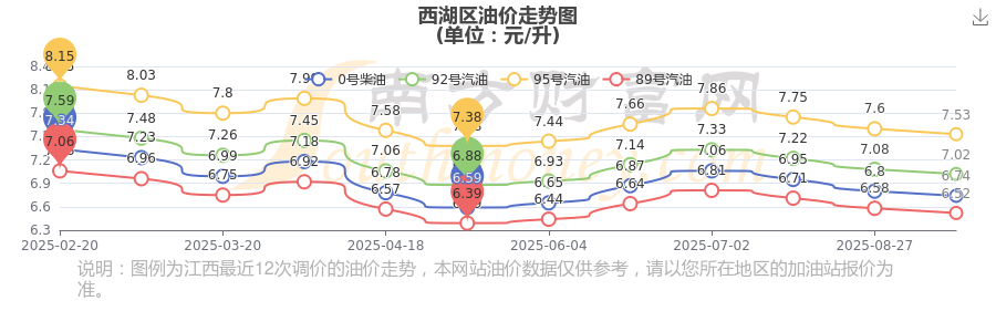 10月26日,西湖区汽油、柴油每升最新价格:调整时间为10月14日,92号汽油为7.02元,下跌了0.06元,下跌幅达0.85%;95号汽油为7.53元,下跌了0.07元,下跌幅达0.92%;89号汽油为6.52元,下跌了0.06元,下跌幅达0.91%;0号柴油为6.74元,下跌了0.06元,下跌幅达0.88%。