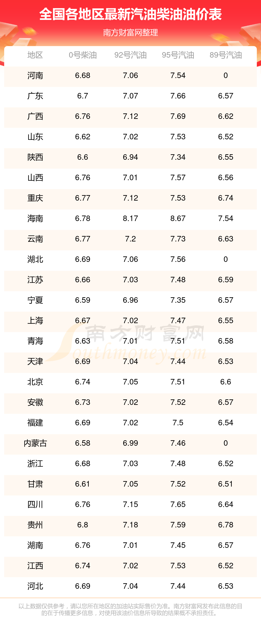 全国各地区最新油价表