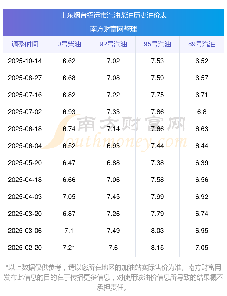 山东烟台招远市今日油价:10月26日山东烟台招远市汽油价格一览表