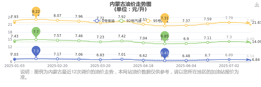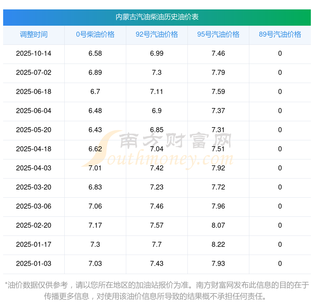 内蒙古汽油、柴油10月26日每升最新价格为10月14日调整后的价格,具体为:92号汽油6.99元,跌了0.06元;95号汽油7.46元,跌了0.07元;0号柴油6.58元,跌了0.06元。