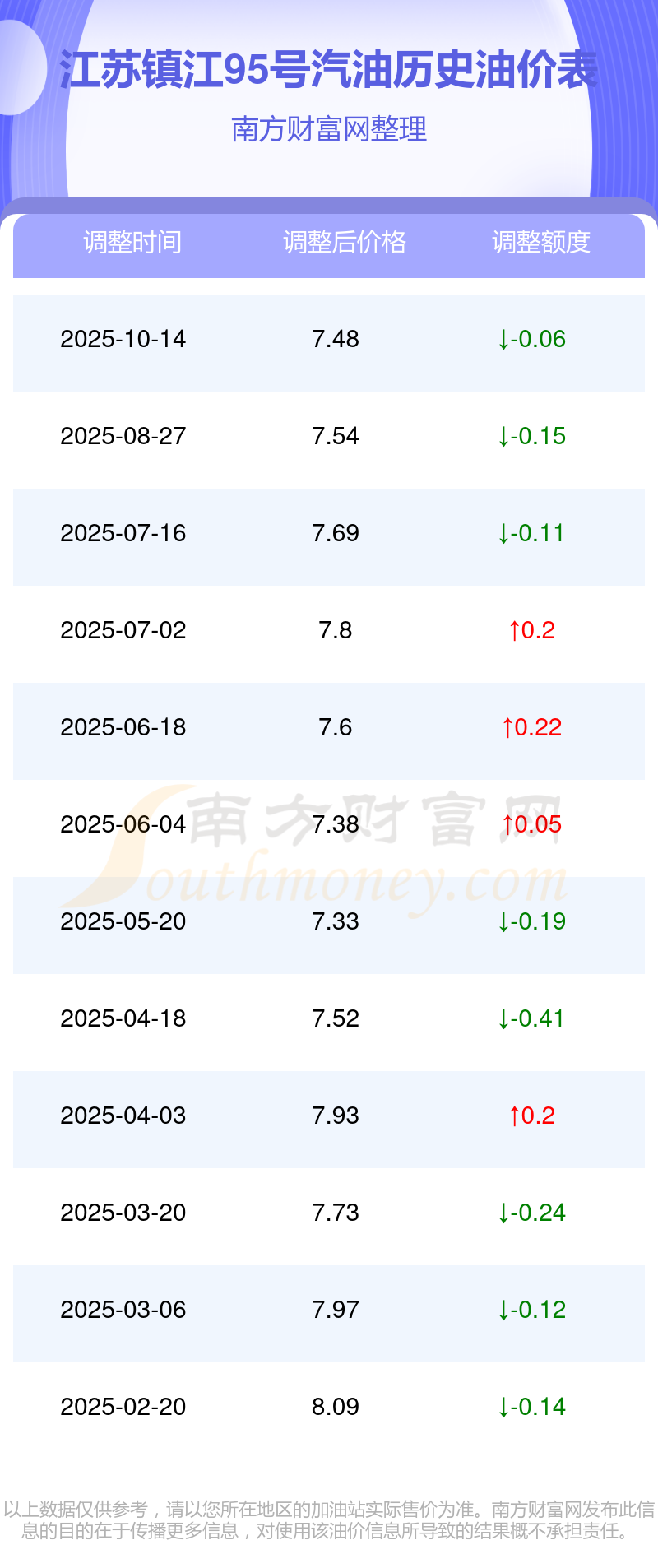 10月26日江苏镇江95号汽油的价格为7.48元/升,本轮油价的调整时间为10月14日,相对上一轮油价调整时间8月27日的价格7.54元/升,降了0.06元,降幅达0.796%。