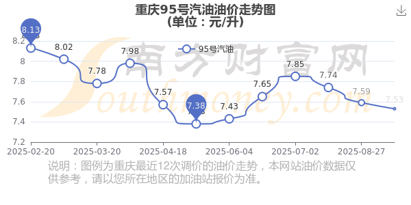 10月26日,重庆95号汽油的价格是7.53元每升,本次的调整时间为10月14日,对比上次的调整减了0.06元,减0.791%,10月27日24时为下一轮油价调整时间,还有1.9天。
