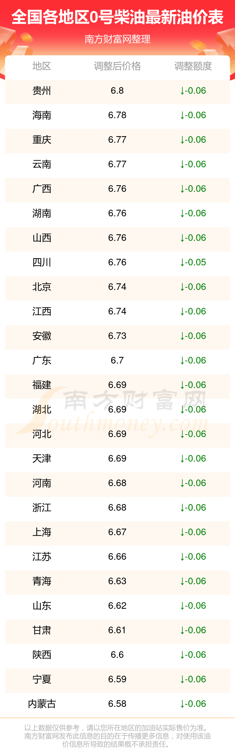 全国各地区最新0号柴油油价表