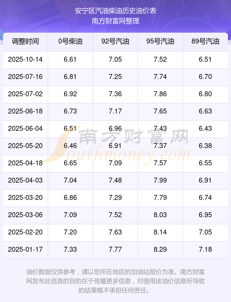 10月26日安宁区今日汽油价格如下:92号汽油7.05元;95号汽油7.52元;89号汽油6.51元;0号柴油6.61元(该价格为10月14日调整后的价格)。