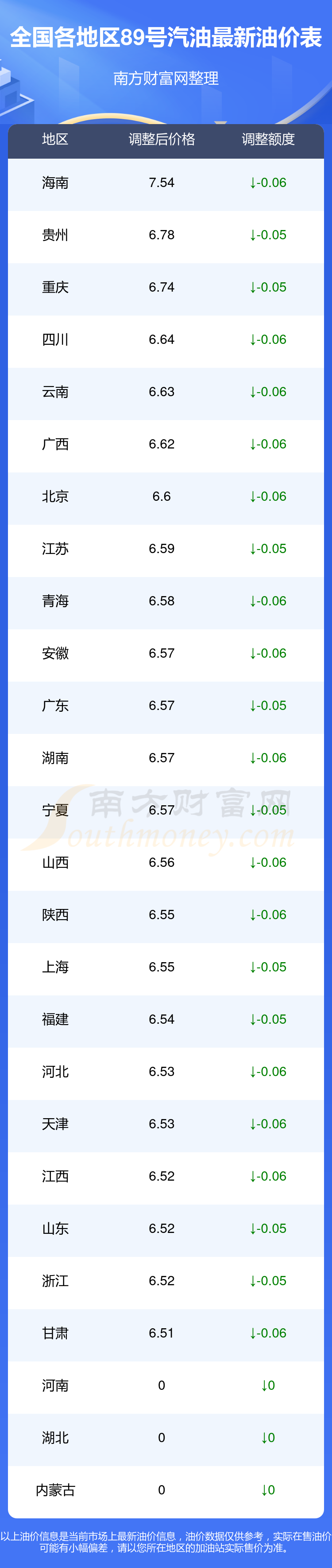 10月27日全国89号汽油最新平均价格为7元每升,本次油价格调整时间为10月14日,其中,全国89号汽油最低为甘肃,价格6.51元/升,89号汽油最高为海南,价格7.54元/升。