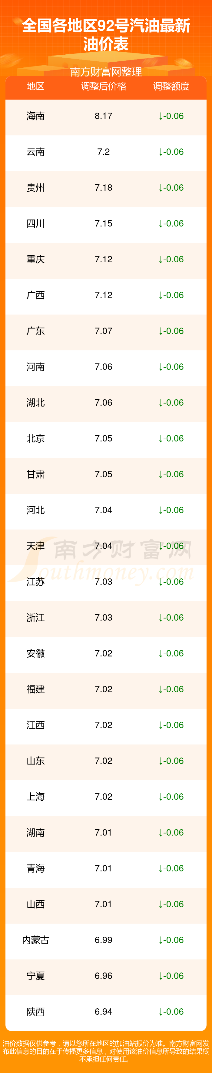 10月27日,全国92号汽油最新平均价格为7元每升(根据10月14日油价调整后计算),其中全国92号汽油最低为陕西,价格6.94元/升,92号汽油最高为海南,价格8.17元/升。