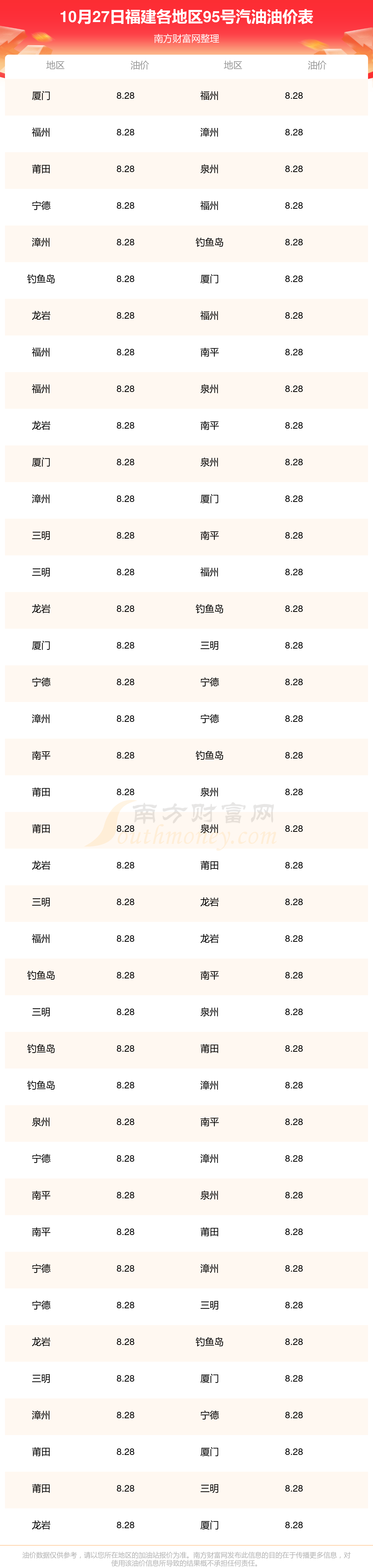 福建各地区最新95号汽油油价表
