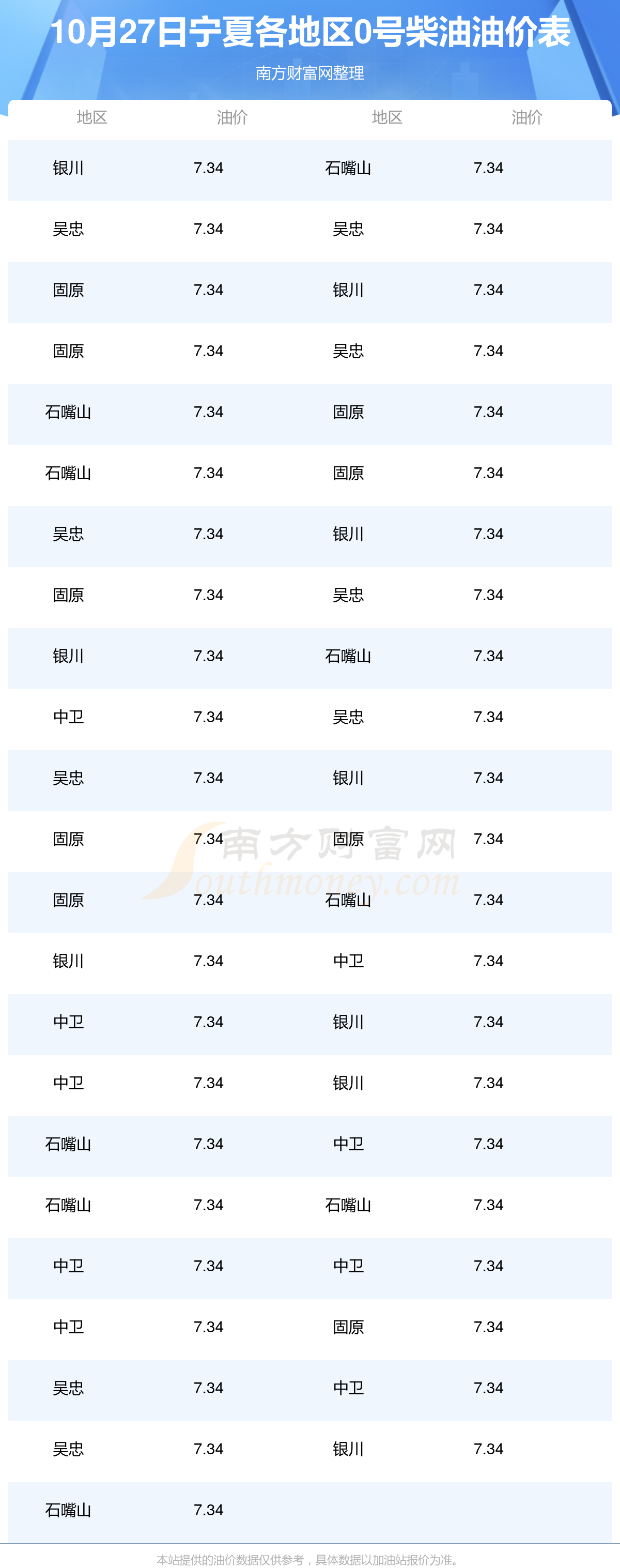 10月27日,宁夏0号柴油价格为6.59元每升,调整时间为10月14日,相对上次调整时间8月27日的油价6.65元/升,降了0.06元。