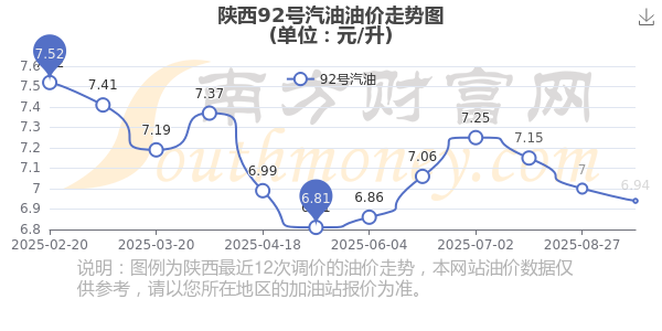 10月27日,陕西92号汽油的价格是6.94元每升,本次的调整时间为10月14日,对比上次的调整下跌了0.06元,下跌0.857%,下次调整时间为10月27日24时,还有0.89天。