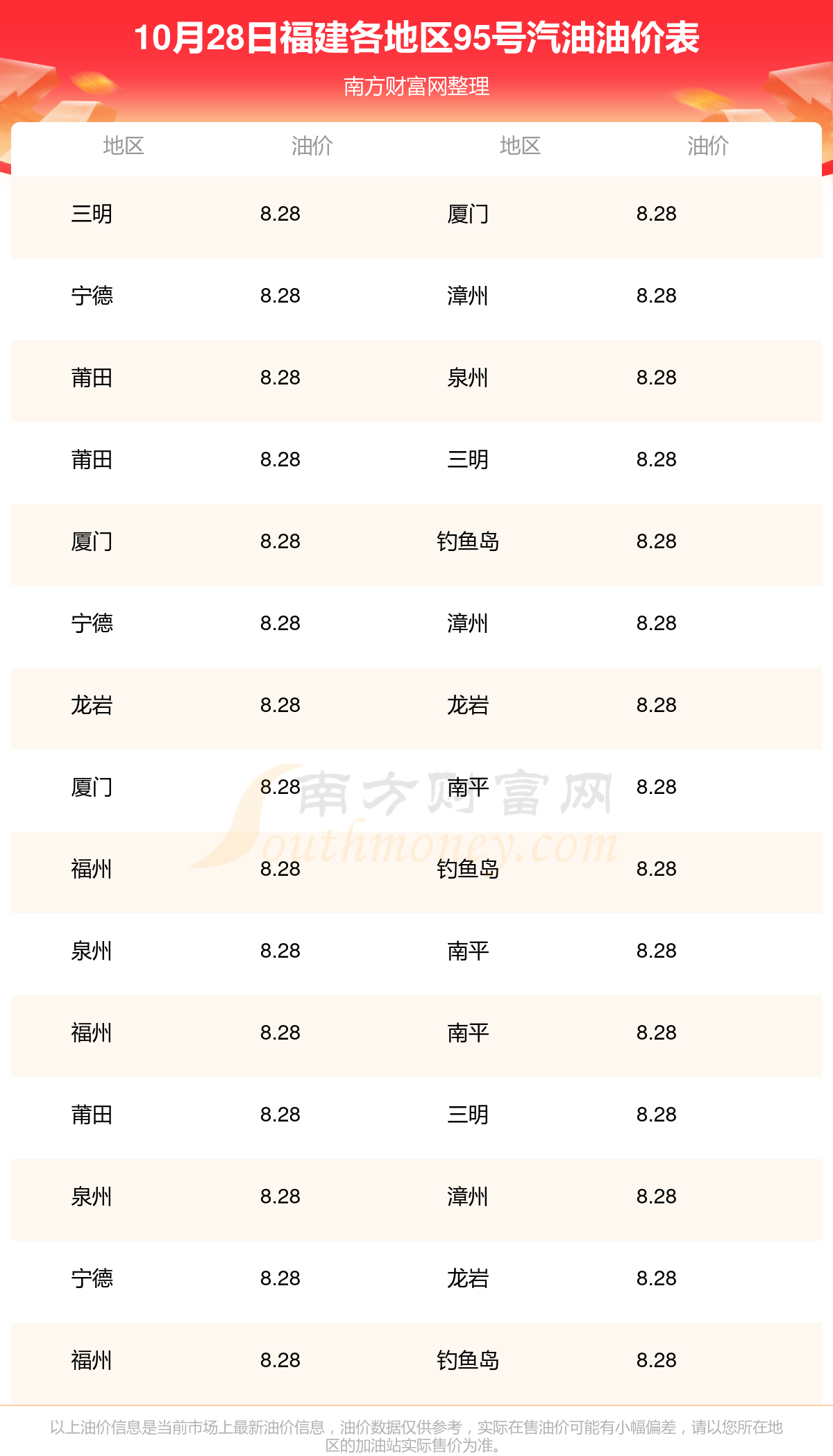 福建各地区最新95号汽油油价表