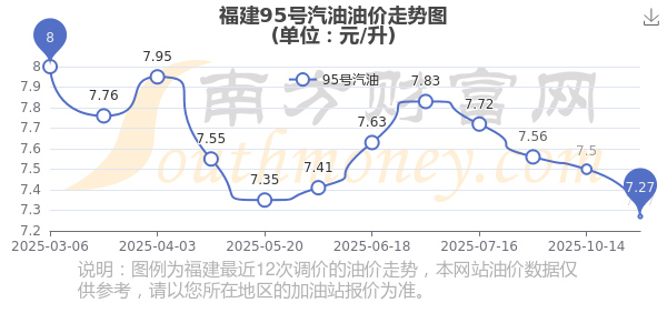 10月28日,福建95号汽油的最新价格为7.27元/升,油价调整时间是10月28日,对比上一轮调整共下跌了0.23元,下跌3.067%。