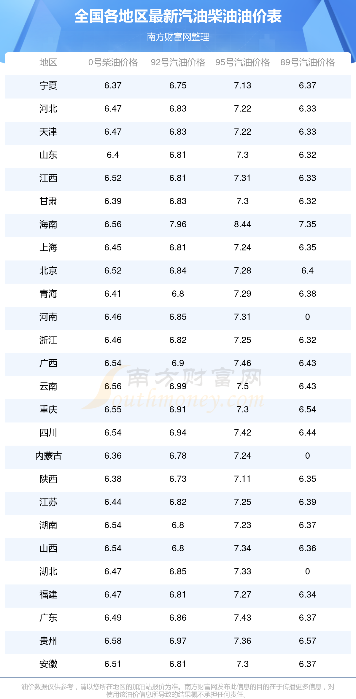 油价数据仅供参考,请以您所在地区的加油站报价为准。油价发布此信息的目的在于传播更多信息,对使用该油价信息所导致的结果概不承担任何责任。