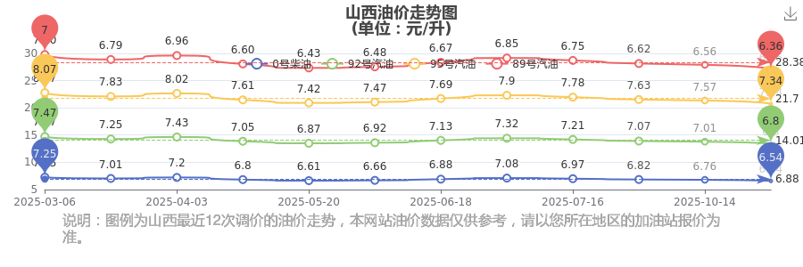 10月28日,山西汽油、柴油每升最新价格为:92号汽油为6.8元,降了0.21元;95号汽油为7.34元,降了0.23元;89号汽油为6.36元,降了0.2;0号柴油为6.54元,降了0.22元,调整时间为10月28日。