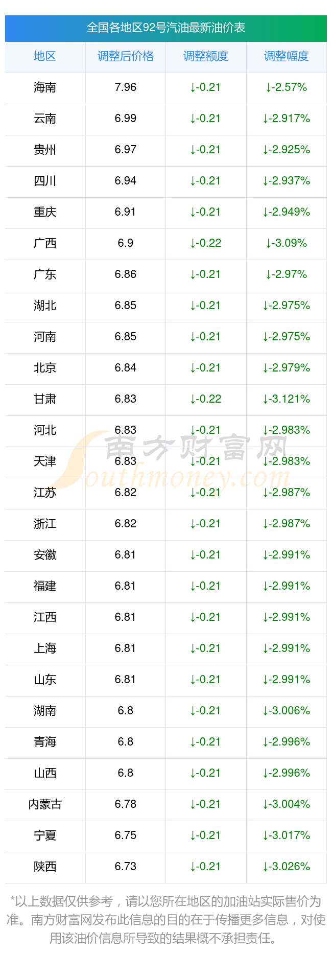以上数据仅供参考,请以您所在地区的加油站实际售价为准。油价发布此信息的目的在于传播更多信息,对使用该油价信息所导致的结果概不承担责任。