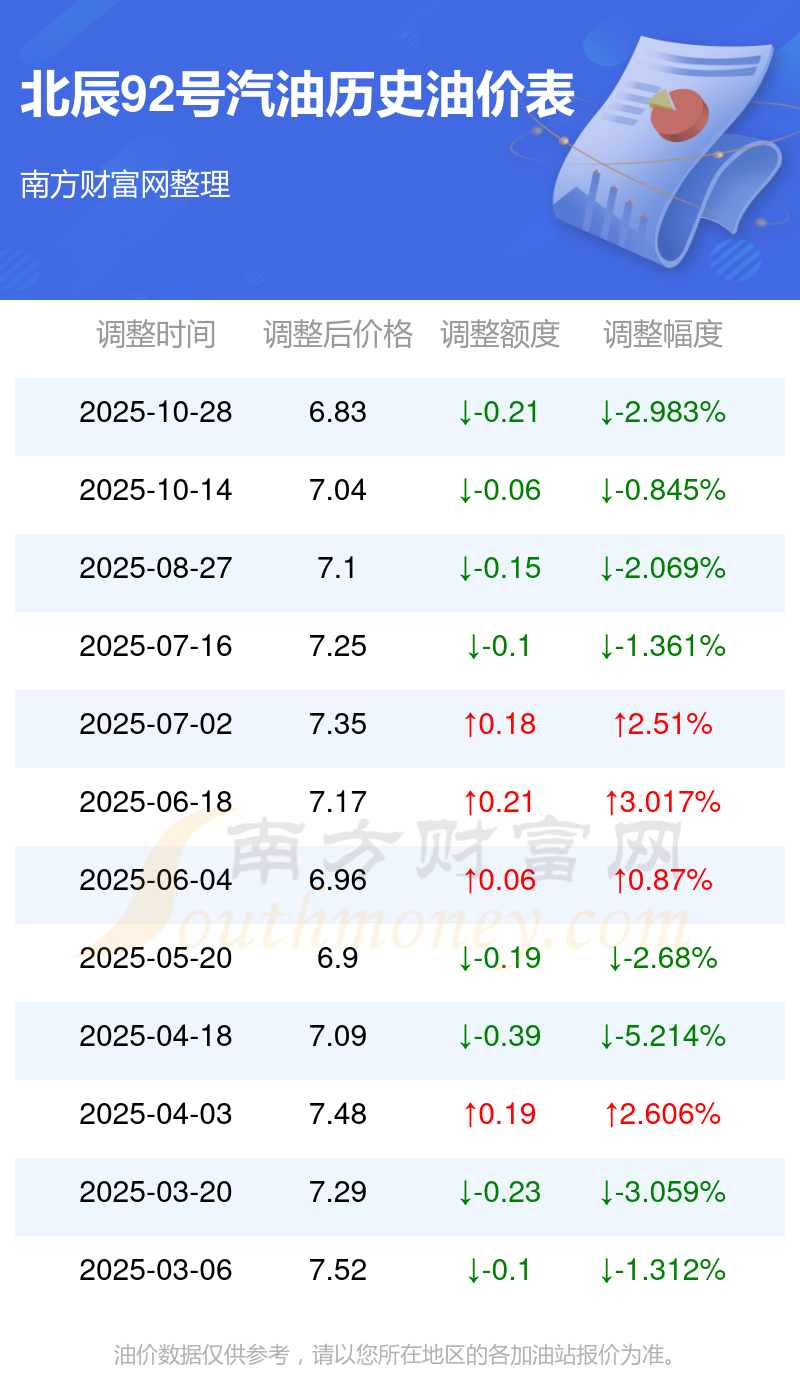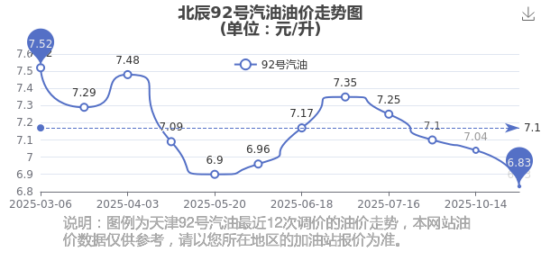 北辰92号汽油10月28日最新价格为6.83元/升,为10月28日油价调整后的价格,相对上次调整时间10月14日的油价7.04元每升,下调了0.21元,下调2.983%。