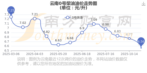 10月28日,云南0号柴油的价格是6.56元每升,本次的调整时间为10月28日,对比上次的调整下跌了0.21元,下跌3.102%,11月10日24时为下一轮油价调整时间,还有13.96天。