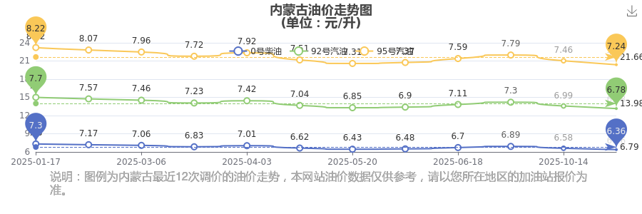 10月29日内蒙古汽油、柴油的价格多少钱一升?本轮油价调整时间是10月28日,92号汽油6.78元,下跌了0.21元,下跌幅达3%;95号汽油7.24元,下跌了0.22元,下跌幅达2.95%;0号柴油6.36元,下跌了0.22元,下跌幅达3.34%。
