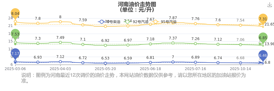 10月29日河南汽油、柴油的价格多少钱一升?本轮油价调整时间是10月28日,92号汽油6.85元,跌了0.21元,跌幅达2.98%;95号汽油7.31元,跌了0.23元,跌幅达3.05%;0号柴油6.46元,跌了0.22元,跌幅达3.29%。