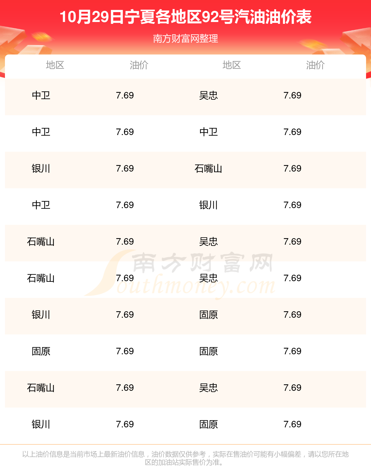 宁夏各地区最新92号汽油油价表