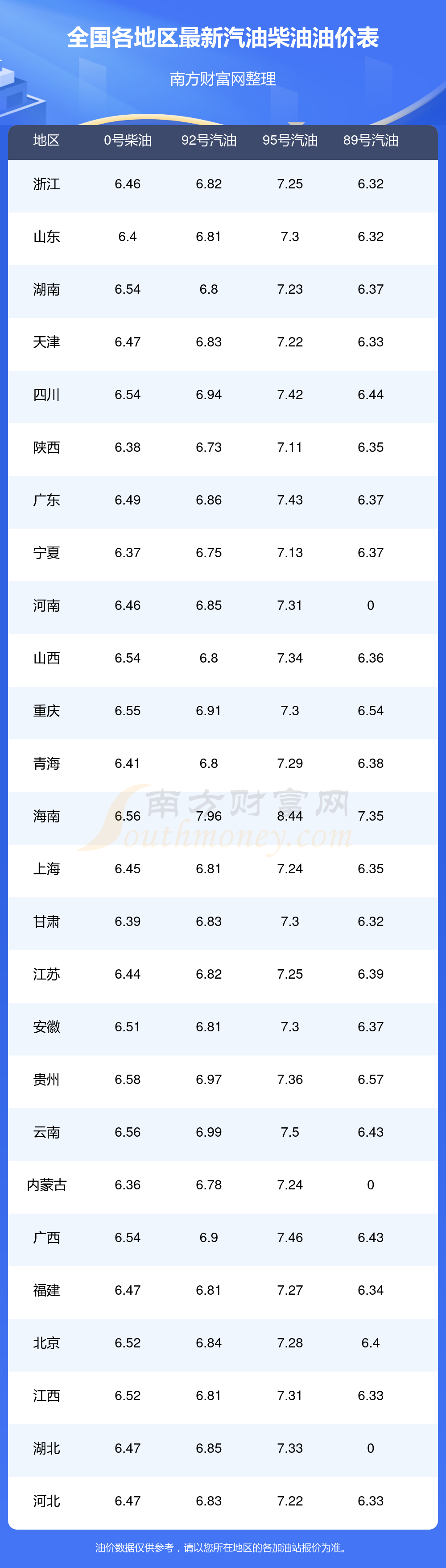 以上数据仅供参考,请以您所在地区的加油站实际售价为准。油价发布此信息的目的在于传播更多信息,对使用该油价信息所导致的结果概不承担责任。
