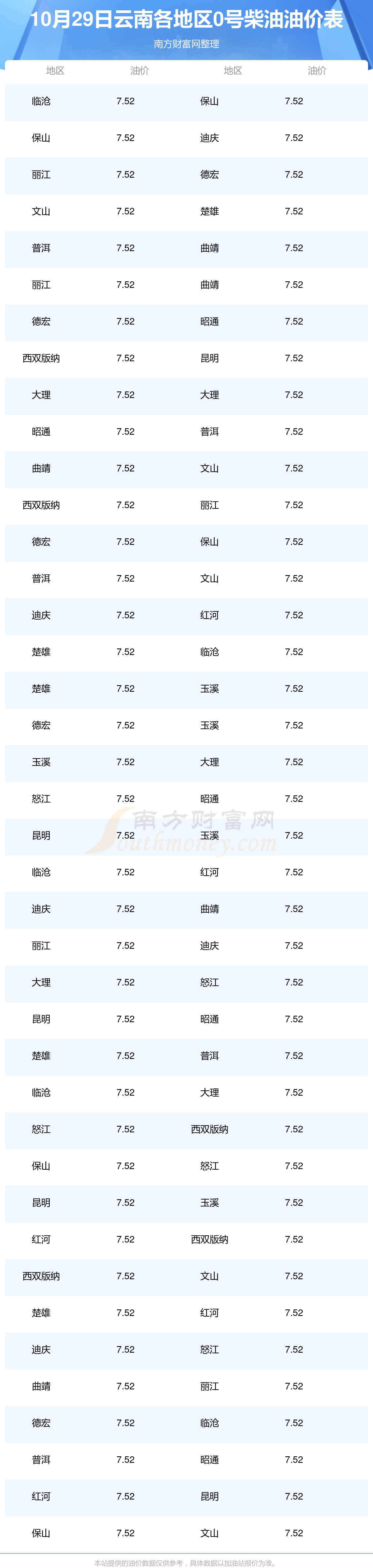 云南各地区最新0号柴油油价表