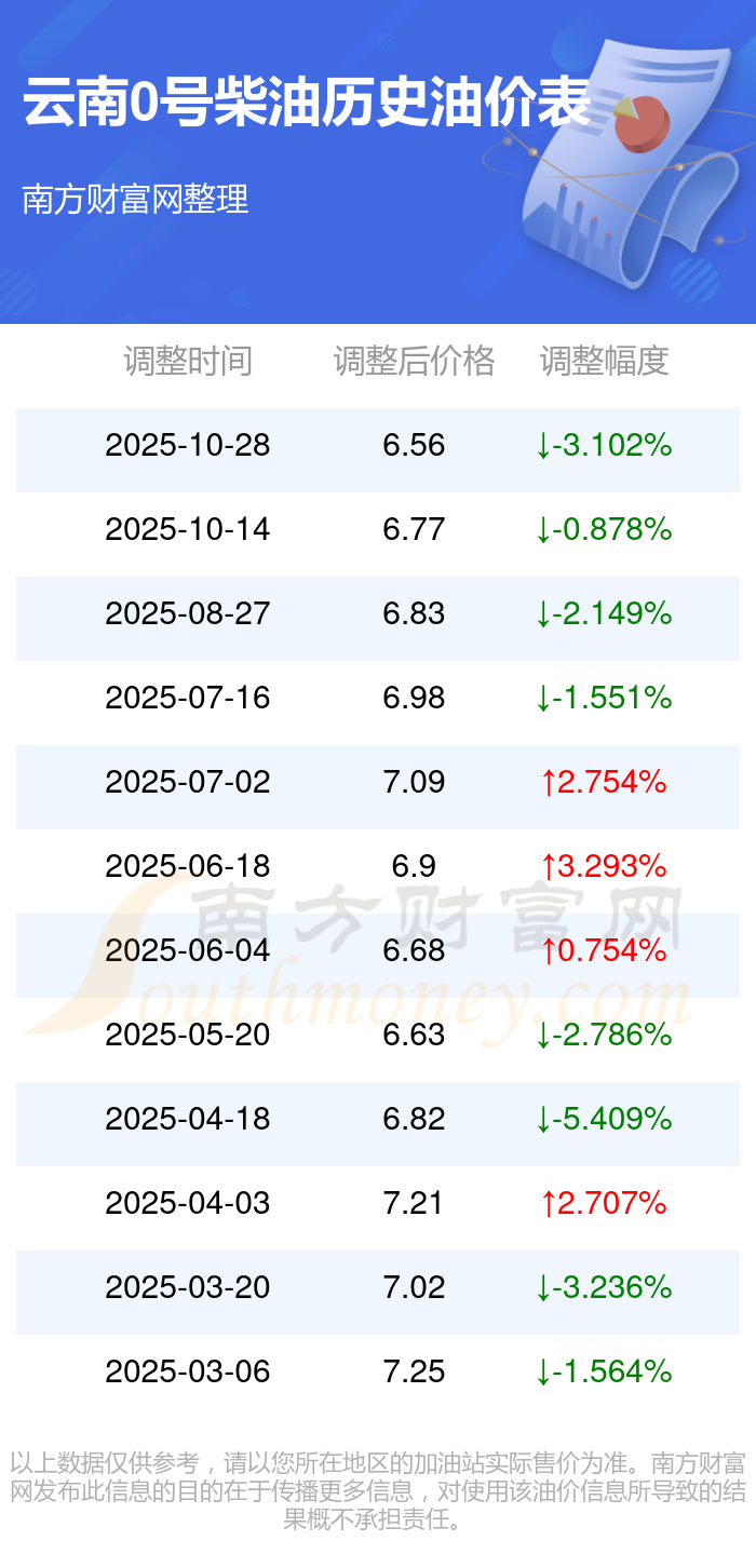 云南0号柴油历史油价表