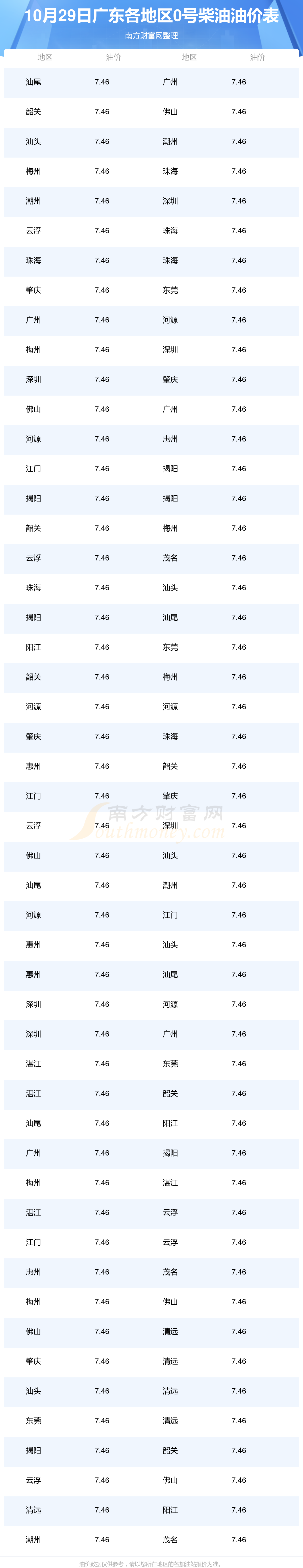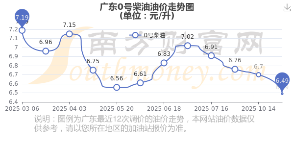 10月29日广东0号柴油价格为6.49元每升,本次调整时间为10月28日,相对上次降了0.21元,降3.134%。