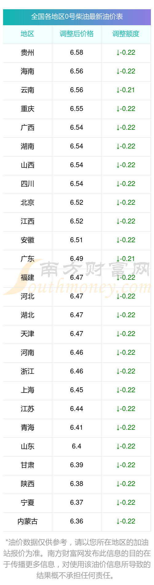 全国0号柴油10月29日最新平均价格为6元每升(根据10月28日油价调整后计算),其中全国0号柴油最低为内蒙古,价格6.36元/升,0号柴油最高为贵州,价格6.58元/升。
