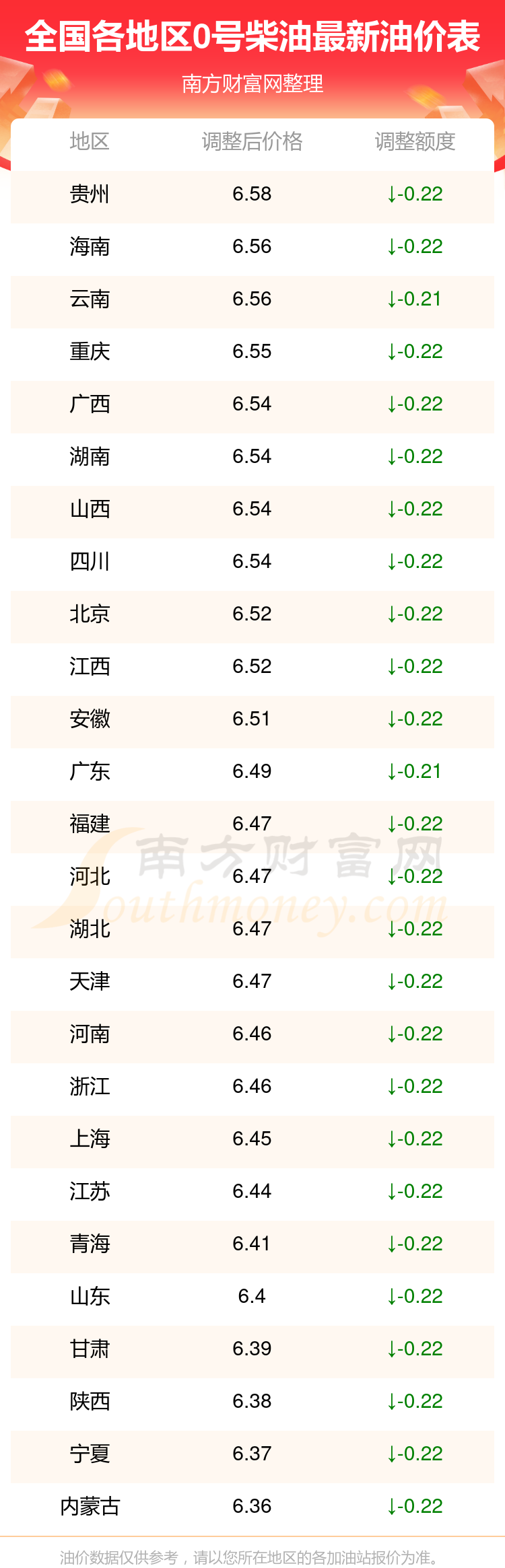全国0号柴油10月29日最新平均价格为6元/升,调整时间为10月28日。其中,全国0号柴油最低为内蒙古,价格为6.36元/升;0号柴油最高为贵州,价格为6.58元/升。