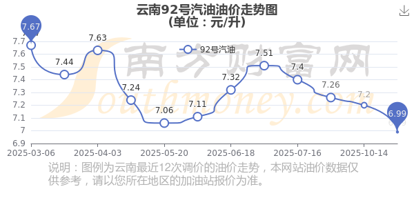 10月29日云南汽油、柴油油价:本轮油价调整时间是10月28日,92号汽油6.99元,下降了0.21元,下降幅达2.92%;95号汽油7.5元,下降了0.23元,下降幅达2.98%;89号汽油6.43元,下降了0.2元,下降幅达3.02%;0号柴油6.56元,下降了0.21元,下降幅达3.1%。