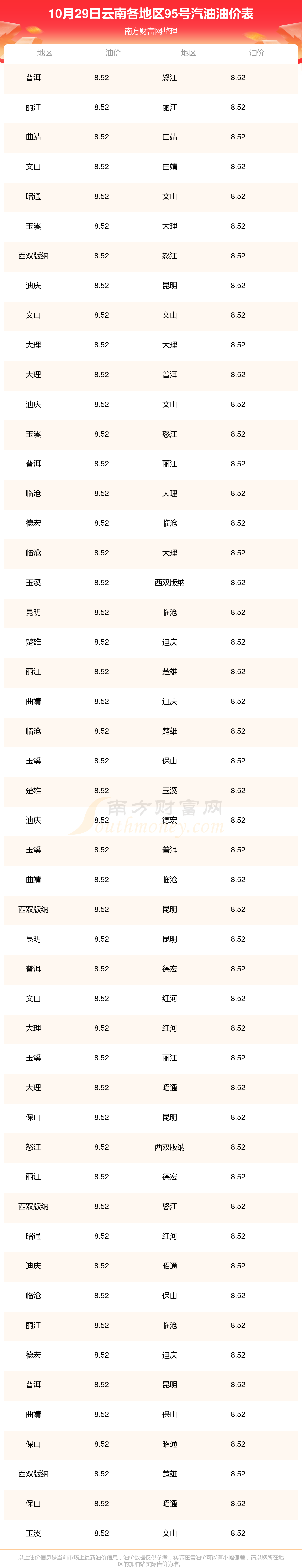 10月29日云南95号汽油油价多少钱一升(云南今日油价)