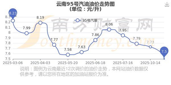 云南95号汽油10月29日的价格是7.5元每升,这是10月28日调整后的价格,相对比上次调整时间10月14日的油价7.73元每升,减了0.23元。