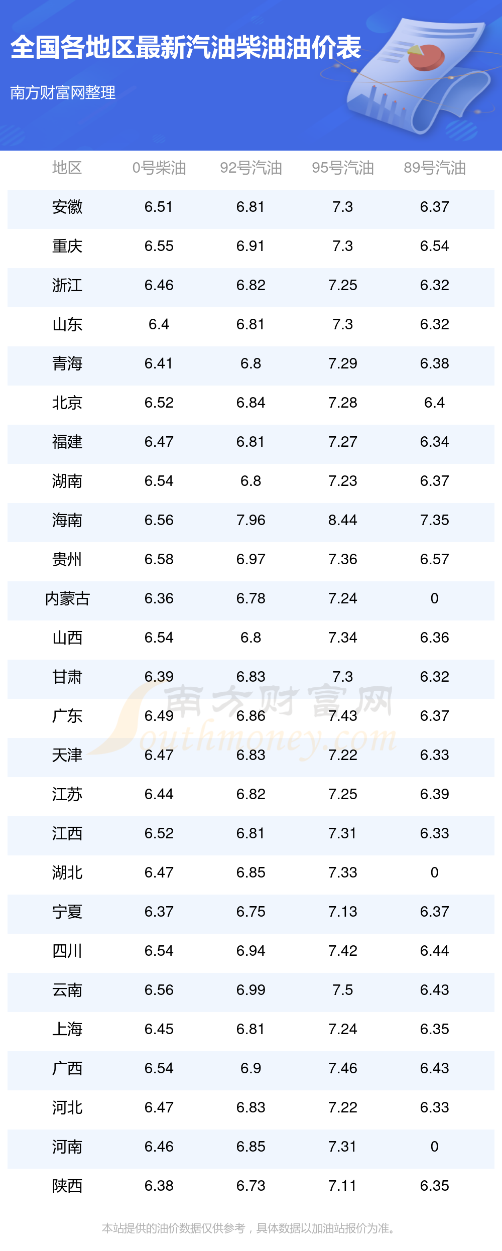 油价数据仅供参考,请以您所在地区的加油站报价为准。油价发布此信息的目的在于传播更多信息,对使用该油价信息所导致的结果概不承担任何责任。
