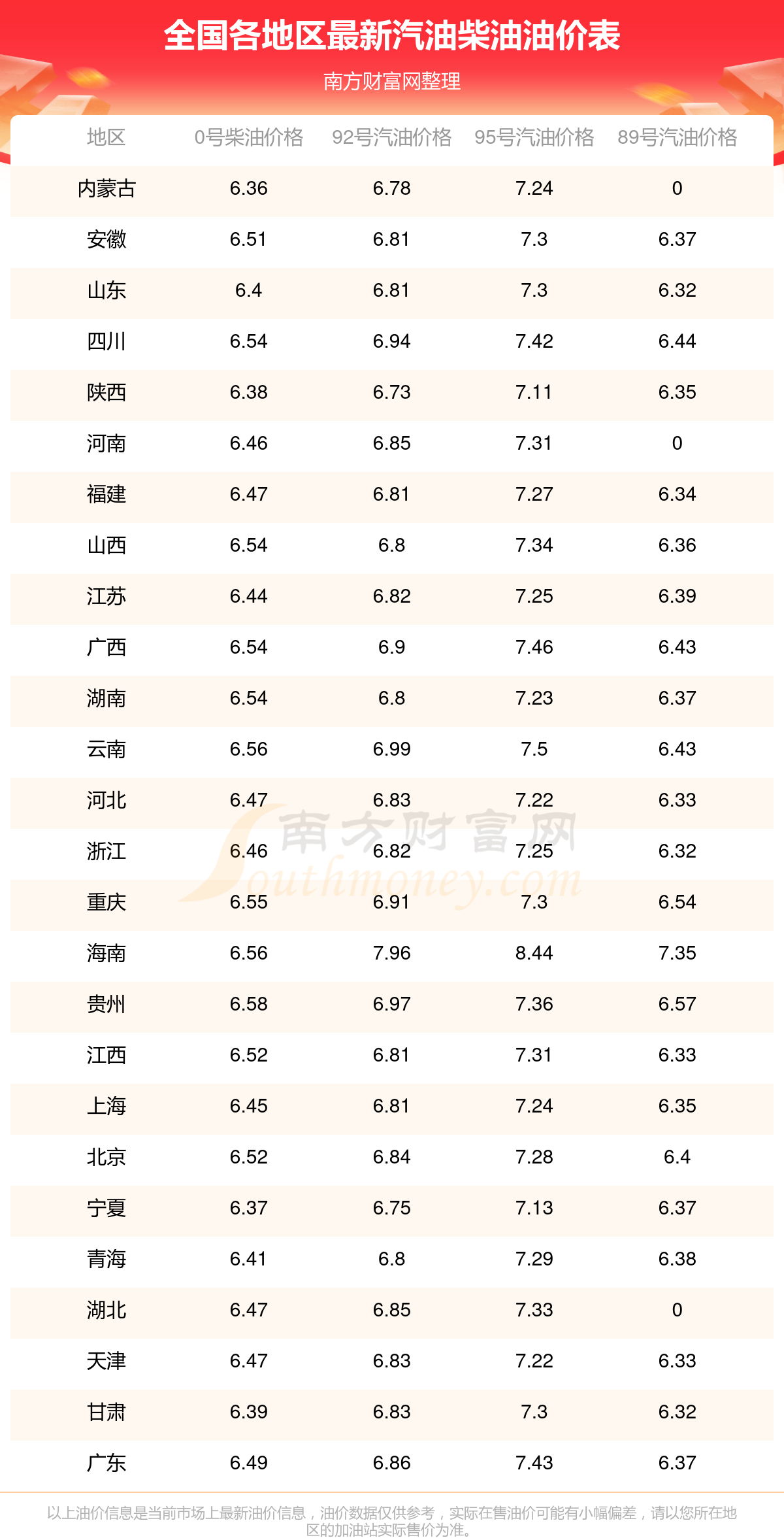 全国89号汽油10月29日的最新价格是10月28日油价调整后的价格,当中,平均价格为6元/升,最低的是浙江,价格6.32元/升,最高的是海南,价格7.35元/升。