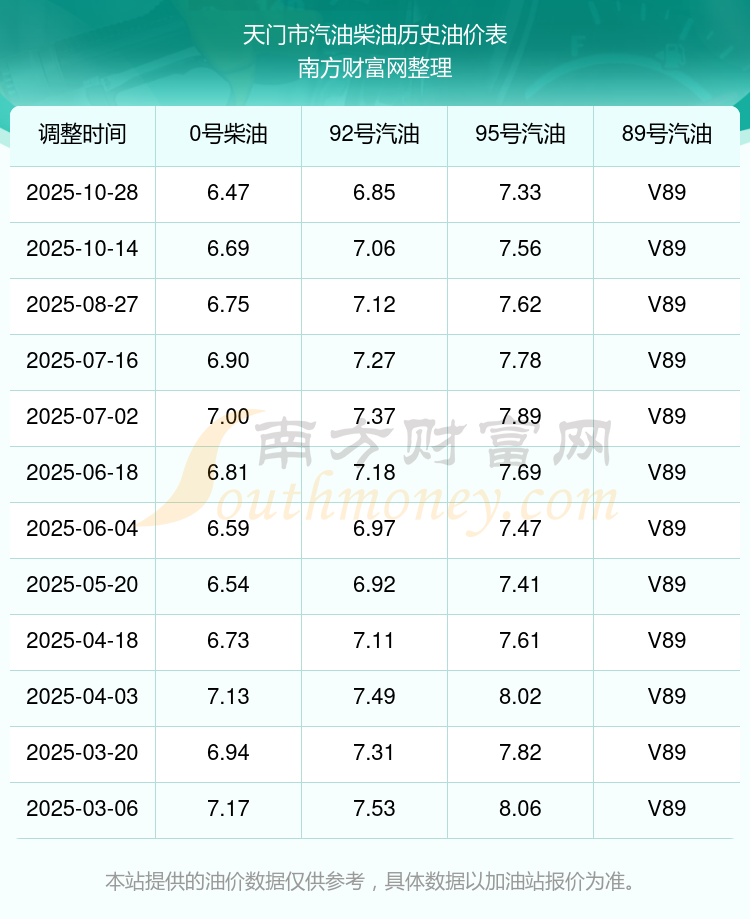 天门市今日油价:10月29日天门市汽油柴油价格查询