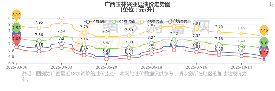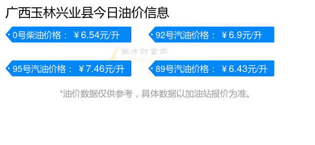 10月29日,广西玉林兴业县汽油、柴油每升的价格为10月28日调整后的价格,具体为:92号汽油为6.9元,下跌了0.22元,下跌幅达3.09%;95号汽油为7.46元,下跌了0.23元,下跌幅达2.99%;89号汽油为6.43元,下跌了0.19元,下跌幅达2.87%;0号柴油为6.54元,下跌了0.22元,下跌幅达3.25%。