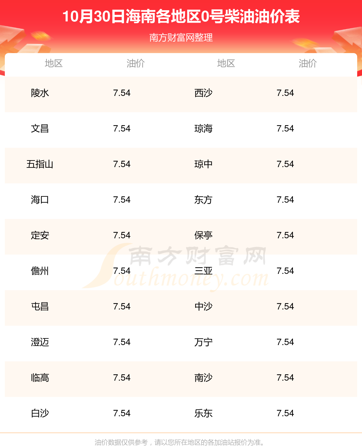 海南各地区最新0号柴油油价表