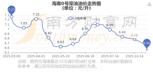 10月30日海南0号柴油的价格是10月28日调整后的价格,为6.56元每升,相对上一轮调整下调了0.22元,下调3.245%。