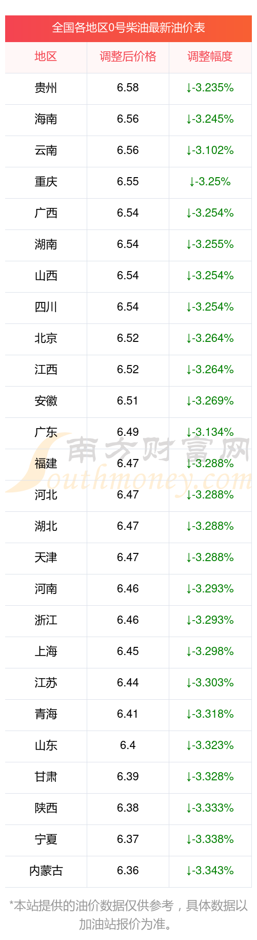10月30日,全国0号柴油的最新价格是10月28日油价调整后的价格,具体为:平均价格6元/升,最低的是内蒙古,价格6.36元/升,最高的是贵州,价格6.58元/升。