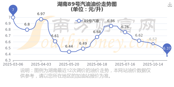 10月30日,湖南89号汽油的价格是6.37元每升,本次的调整时间为10月28日,对比上次的调整跌了0.2元,跌3.006%,11月10日24时为下一轮油价调整时间,还有11.96天。
